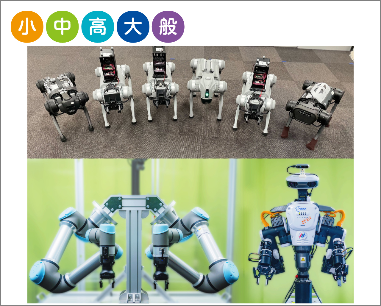 ロボットアームや犬型ロボットとふれあいながら、AIで学習したロボットのかしこさや動きを楽しめるデモを行います。