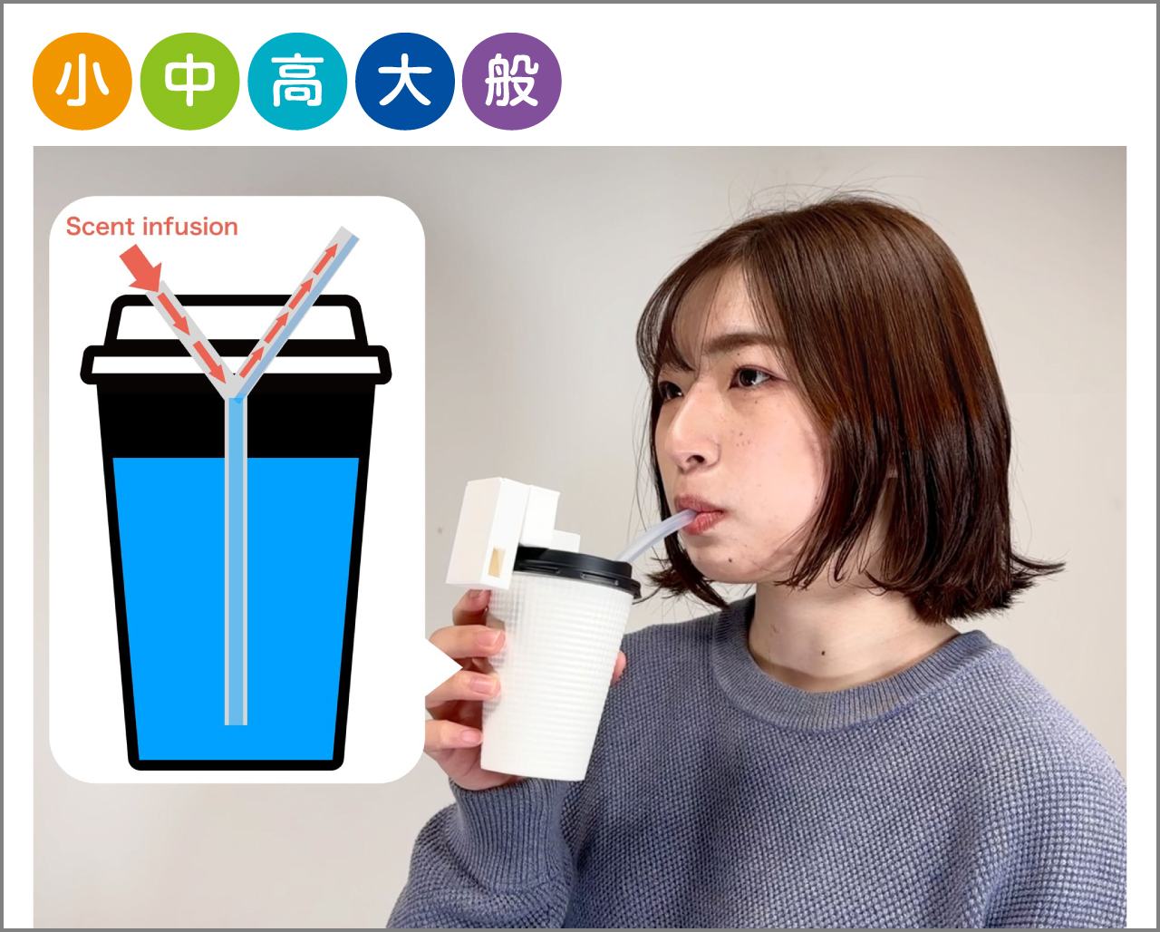 香りで味覚が変わる新しい体験ができます。飲み物と香りを同時に口に摂取することで甘さの感じ方や味を変化させるデバイスです。五感で楽しむ未来の味覚を、ぜひご体験ください。