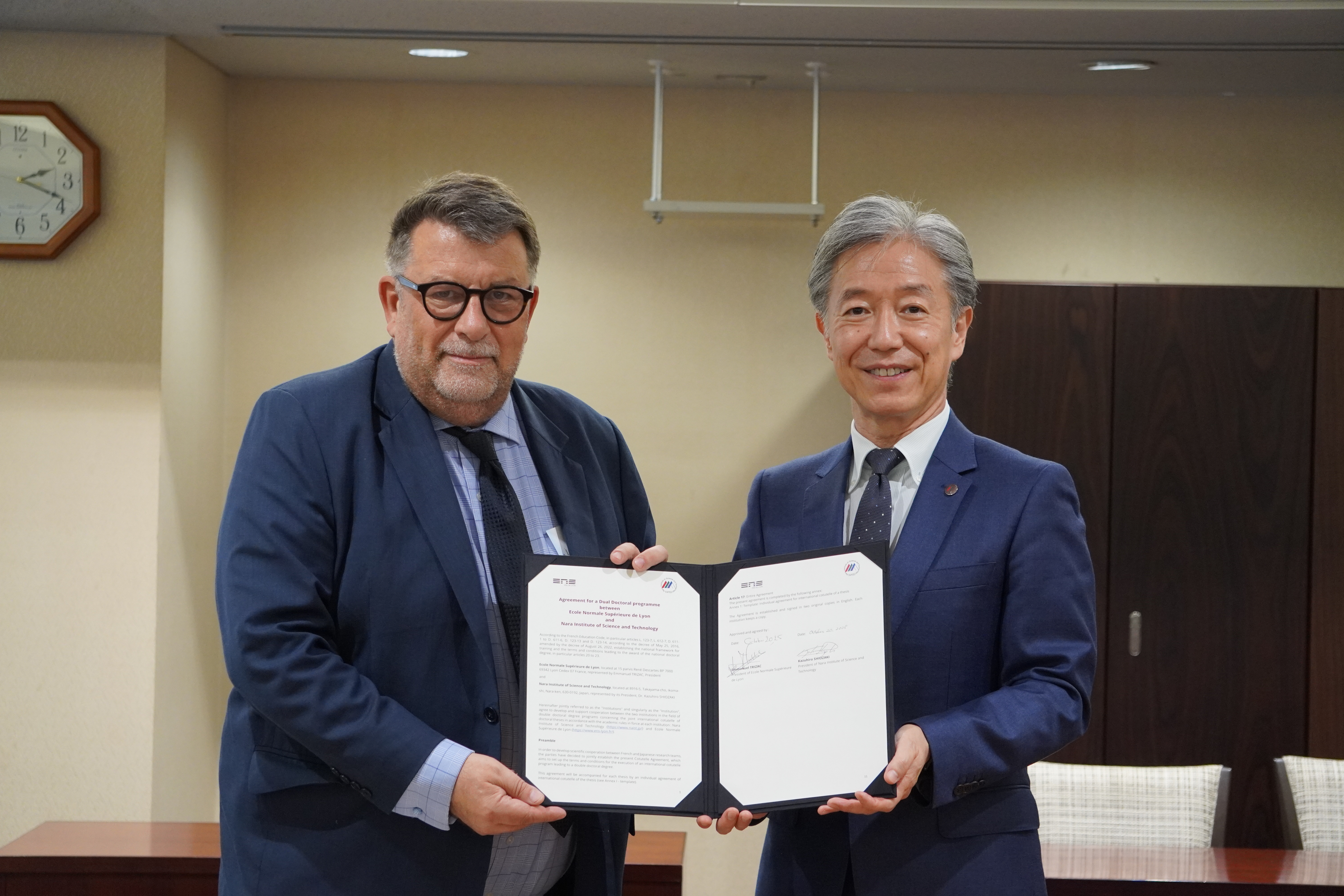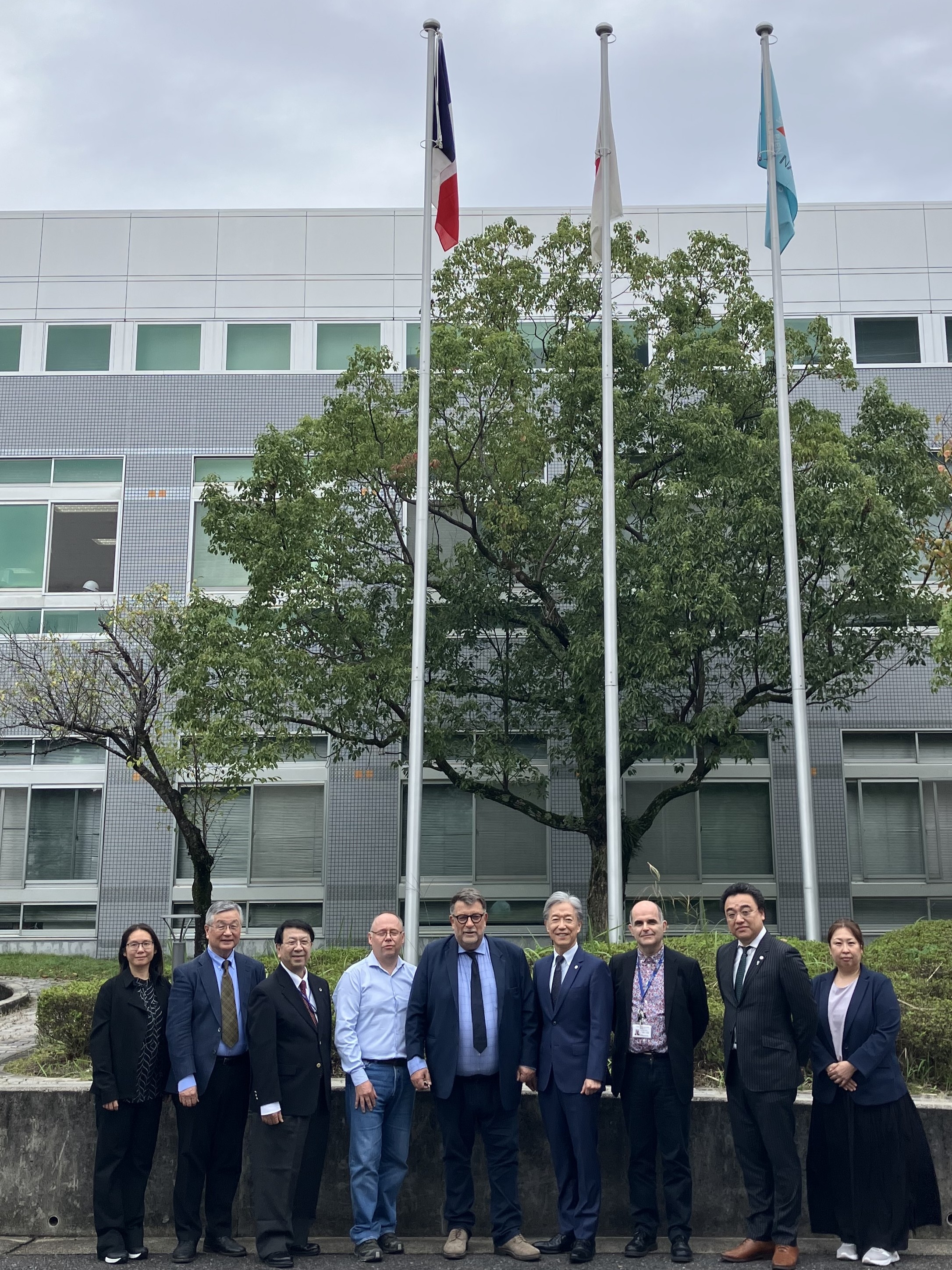 On Monday, October 20, a delegation from the Ecole Normale Supérieure de Lyon, led by Dr. Vincent Michelot, Vice President for International Relations, visited our university. During the courtesy visit, the delegation was welcomed by Dr. Shiozaki Kazuhiro (President), Dr. Ohta Jun (Executive Director/Vice President), Dr. Maki Hisaji (Deputy Director, Strategic Initiative for Global Leadership Development), Prof. Gwénaël Rapenne (Division of Materials Science), and Assoc. Prof. Yasuhara Kazuma (Division of Materials Science).