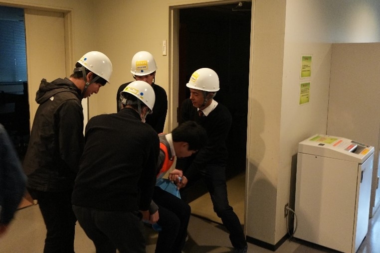 今年度は、生駒市消防本部北分署と連携し、研究科の教職員と学生を対象として、午前10時10分に緊急地震速報が発表された後、大規模地震が発生し、その影響によりバイオサイエンス棟で火災が発生するという想定で実施しました。また、このシナリオに基づき、自衛消防組織による避難誘導、初期消火、負傷者の救護、建物の安全確保を想定した訓練を行うほか、駆け付けた消防隊と自衛消防組織との情報共有の手順についての確認を行いました。