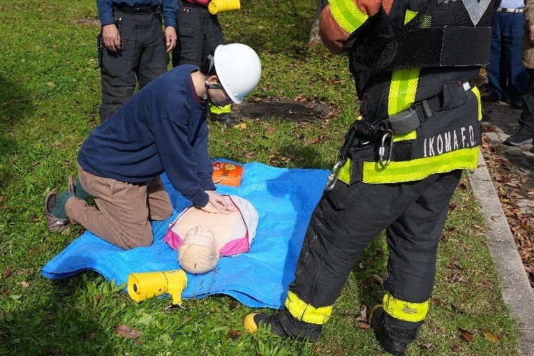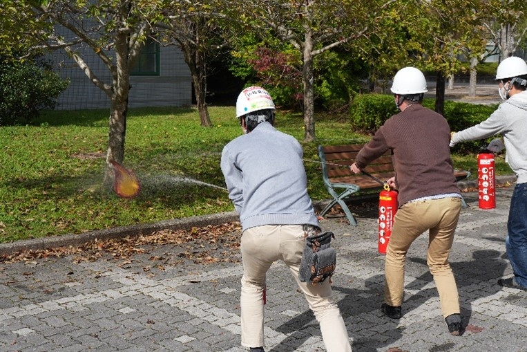 避難訓練終了後には、自衛消防組織の初期消火班・応急救護班及び学生に対して消火器・AEDの使用講習を実施しました。生駒市消防本部北分署によるわかりやすい指導のもと、参加者は使用方法を学びました。