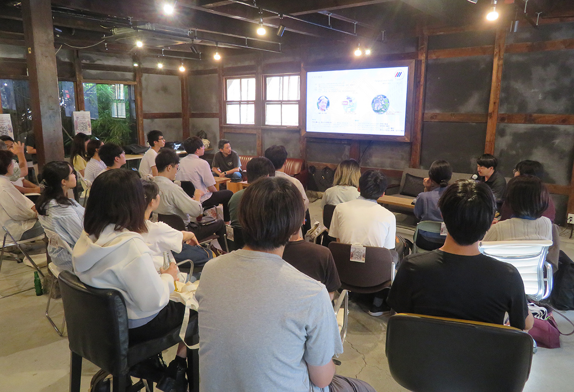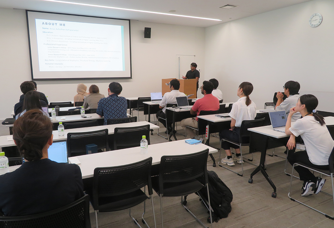 当日は大学院進学に関心のある学部・修士の学生など、約20名が参加しました。まずは両大学の事務局から、それぞれの大学の概要と特徴、研究環境や履修プログラム、入試や学生生活、就学・キャリア支援などに関する説明が行われました。続いて、OISTからは日本の企業で活躍する修了生が、またNAISTからは2名の博士後期課程学生、山本富也さんとMukmin Sapto Pamungkasさんが登壇し、大学院進学に至るまでの思いや学生生活における体験談を披露しました。