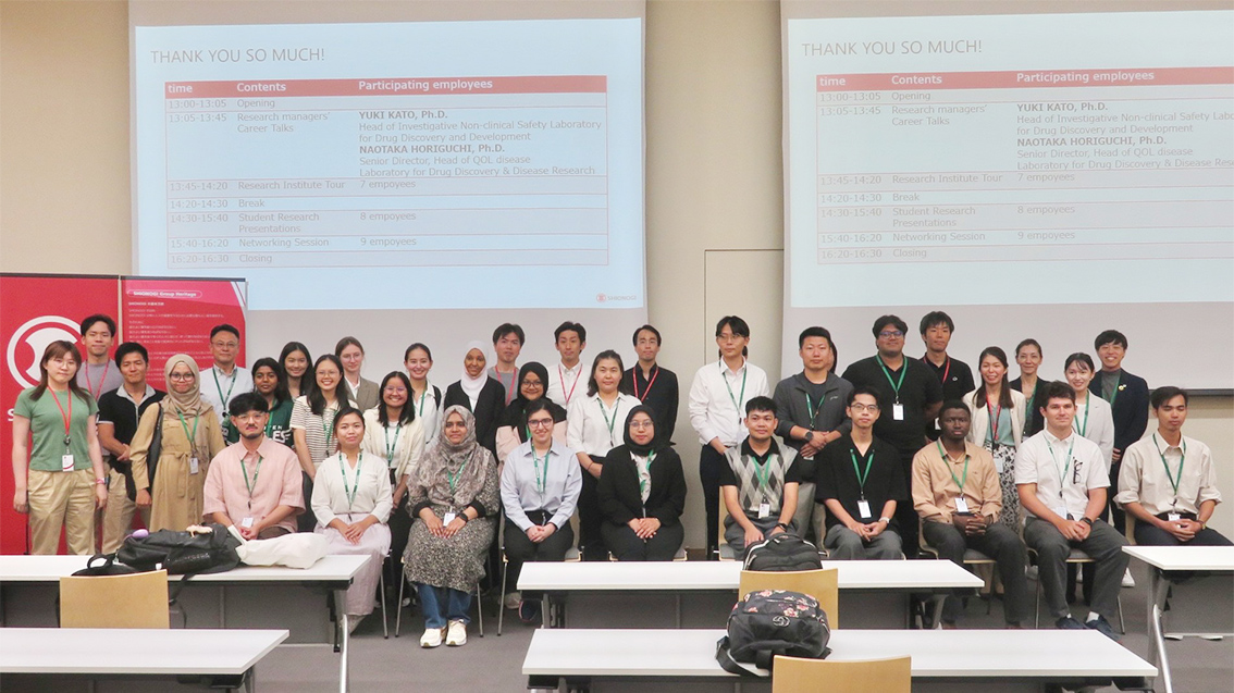 初日は、大阪府豊中市にある塩野義製薬医薬研究センターを訪問しました。博士号を持つ2名の研究所マネジャーからの講演では、日常的に英語で議論が行われる国際的な研究環境や、海外研修制度を活用した人材育成の取り組み等が紹介され、参加学生に大きな刺激を与えました。最新の研究施設の見学に加え、先輩社員との交流会ではキャリア形成や研究者としての働き方に関する率直な意見交換が行われ、学生たちは日本企業や製薬業界で働く将来像をより具体的に描く貴重な機会となりました。